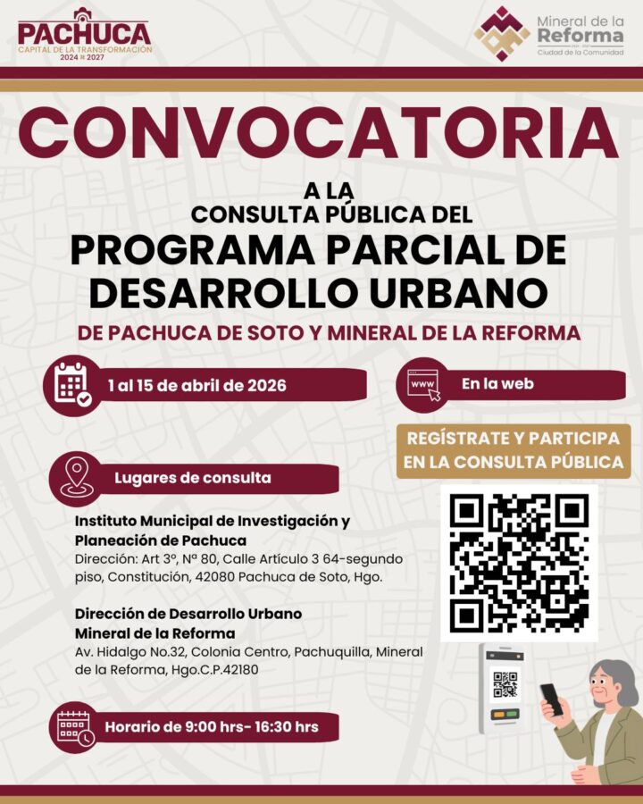 Para facilitar la participación ciudadana, se habilitaron puntos de consulta presencial en el Instituto Municipal de Investigación y Planeación (IMIP) de Pachuca, así como en la Dirección de Desarrollo Urbano de Mineral de la Reforma, donde el documento puede revisarse en un horario de 9:00 a 16:30 horas.