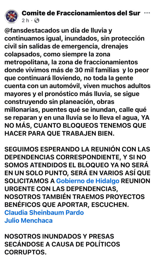 “Un día de lluvia y continuamos igual, inundados, sin protección civil sin salidas de emergencia, drenajes colapsados, como siempre la zona metropolitana, la zona de fraccionamientos donde vivimos más de 30 mil familias y lo peor que continuará lloviendo, no toda la gente cuenta con un automóvil, viven muchos adultos mayores y el pronóstico más lluvia (sic) señala su publicación en redes sociales.