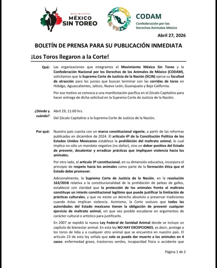 Organizaciones defensoras de los derechos animales en México anunciaron que el próximo 29 de abril solicitarán a la Suprema Corte de Justicia de la Nación ejercer su facultad de atracción sobre diversos juicios que buscan poner fin a las corridas de toros en Aguascalientes, Hidalgo, Jalisco, Nuevo León, Guanajuato y Baja California.