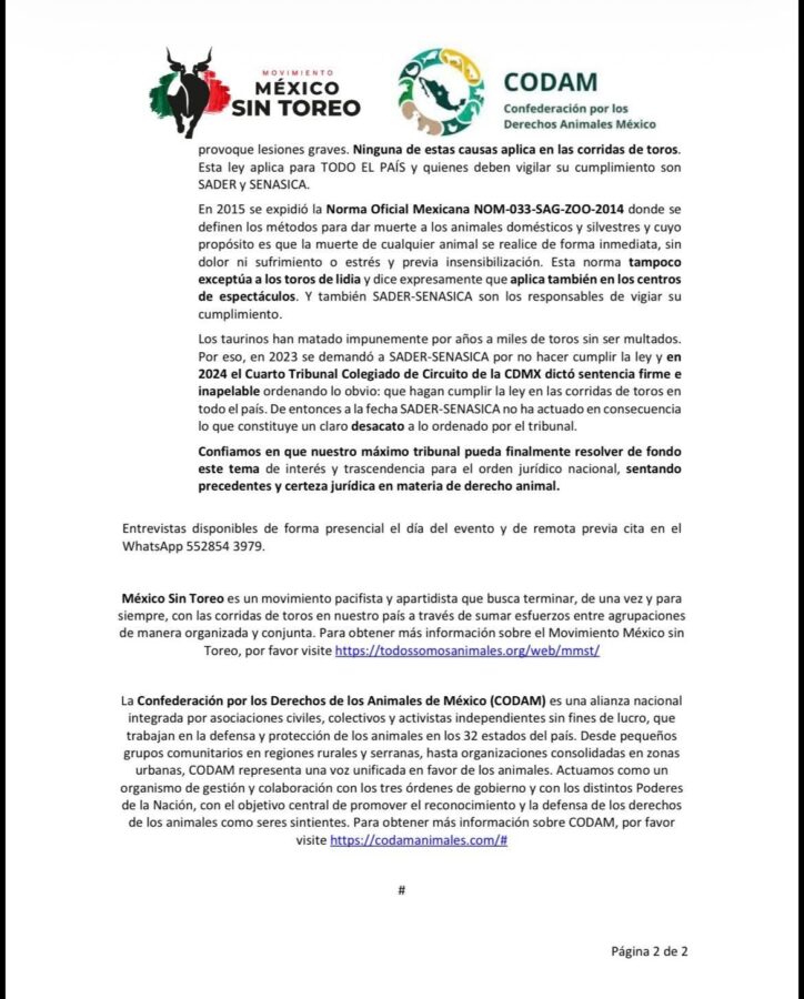 De acuerdo con el comunicado emitido por el Movimiento México Sin Toreo y la Confederación por los Derechos Animales en México, las corridas de toros contravienen disposiciones constitucionales y normas federales vigentes en materia de bienestar animal.