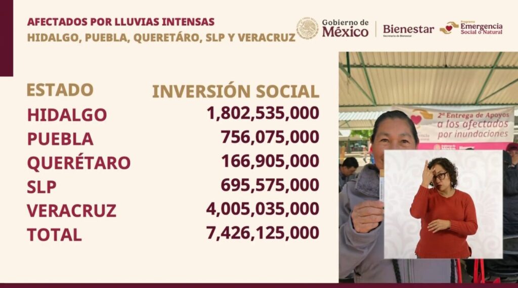 La inversión social para la atención de daños asciende a 7,426 millones 125 mil pesos, distribuidos en limpieza, reparación de viviendas, entrega de enseres, apoyo a locales y apoyo al sector agrícola.