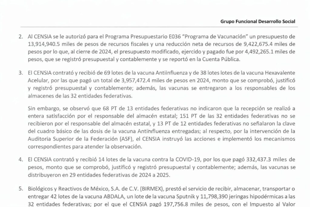 En materia operativa, el informe detalla que el CENSIA contrató y recibió 69 lotes de vacuna antiinfluenza y 38 lotes de vacuna hexavalente acelular, por los que pagó 3 mil 957 millones 472.4 mil pesos en 2024. Las dosis fueron entregadas a responsables de almacenes en las 32 entidades federativas.