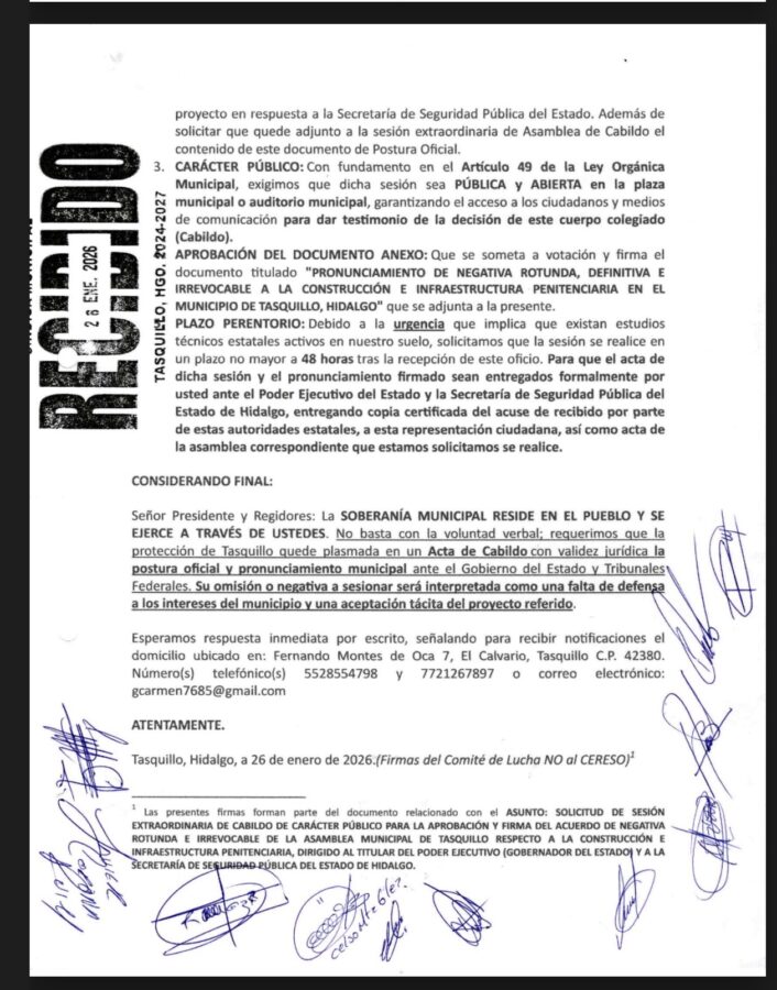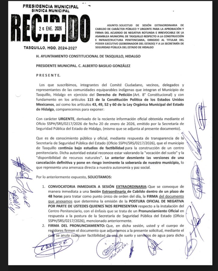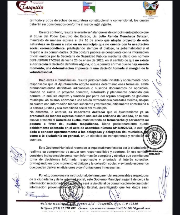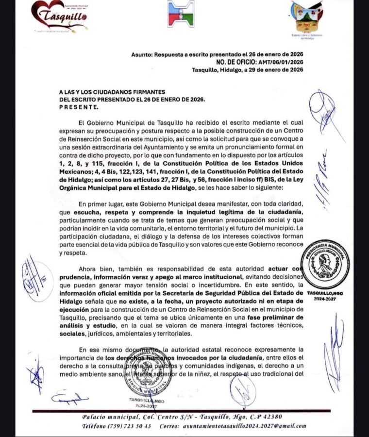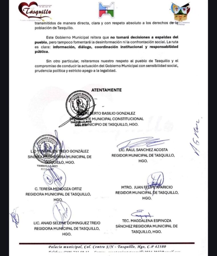 El Ayuntamiento de Tasquillo informó que, en apego a los principios de transparencia, diálogo y respeto a la voluntad ciudadana, se encuentra difundiendo públicamente el documento ingresado por el Comité de Lucha, así como la respuesta oficial emitida a dicho escrito por la autoridad municipal.