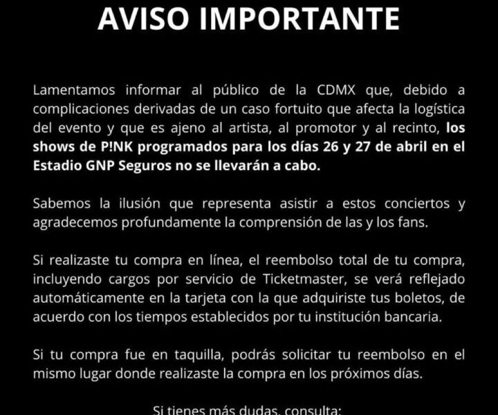 - Por inseguridad y bajas ventas, cancelan conciertos de P!nk, Carolina Ross y Lucho SSJ en la CDMX.