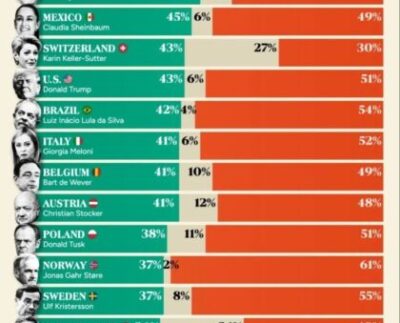 La mandataria mexicana registra 45% de aprobación frente a 49% de desaprobación, una de las brechas más cerradas del comparativo…