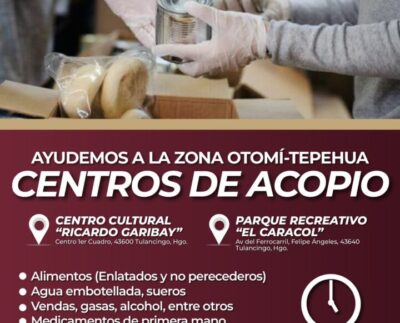 Centros de acopio oficiales en Tulancingo: Centro Cultural “Ricardo Garibay” y el Parque “El Caracol”