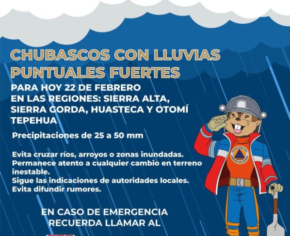 Alerta por chubascos y vientos intensos este 22 de febrero; pide evitar ríos y zonas. La Subsecretaría de Protección Civil y Gestión de Riesgos del Estado de Hidalgo informó que…