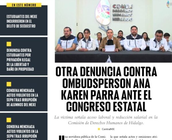 La víctima señala acoso laboral y reducción salarial en la Comisión de Derechos Humanos de Hidalgo. Una servidora pública de la Comisión de Derechos Humanos del Estado de Hidalgo (CDHEH)…