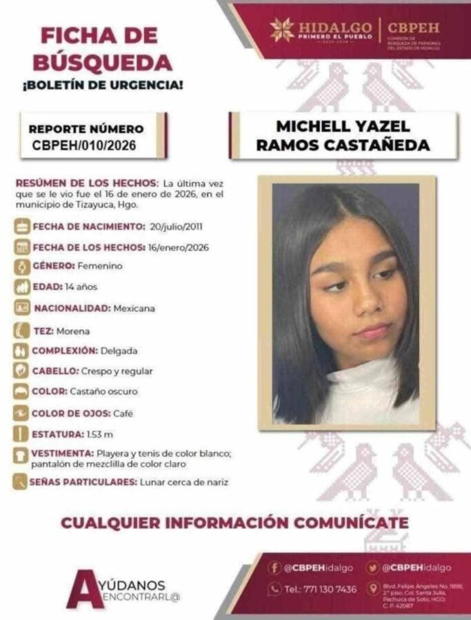 Cualquier información que ayude a dar con su paradero puede comunicarse al 771 130 7436, número habilitado por la Comisión de Búsqueda de Personas del Estado de Hidalgo.