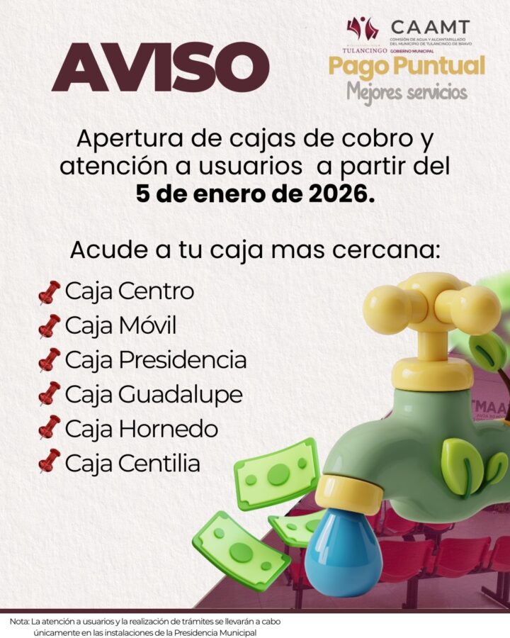 La Comisión de Agua y Alcantarillado del Municipio de Tulancingo (CAAMT) informó que a partir del próximo 5 de enero de 2026 se reanudará la atención a usuarios y comenzará de manera oficial el cobro del servicio de agua potable correspondiente al ejercicio fiscal 2026.