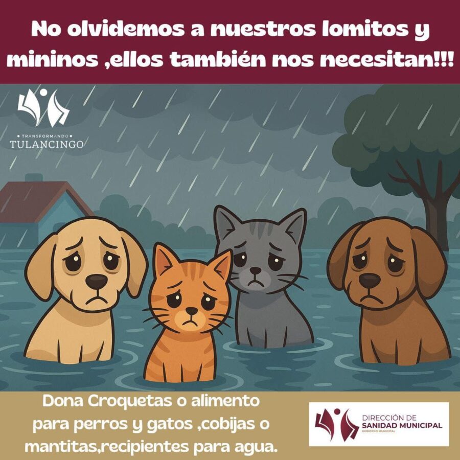 Asimismo, solicita ayuda para lomitos y mininos afectados por las intensas lluvias, inundaciones y deslaves que se han registrado en las zonas de Huehuetla, Tenango de Doria y San Bartolo Tutotepec, las cuales han dejado a muchos animalitos de compañía sin hogar, sin alimento y en condiciones vulnerables.