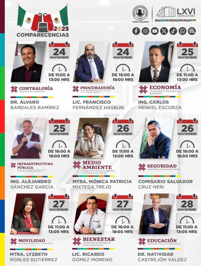 El calendario oficial difundido por el Poder Legislativo establece que las comparecencias se realizarán del 18 al 28 de noviembre de 2025, luego de que este ejercicio se pospusiera durante el mes de octubre debido a las inundaciones y afectaciones registradas en diversas regiones del estado, que requirieron la atención prioritaria de las autoridades estatales y municipales.