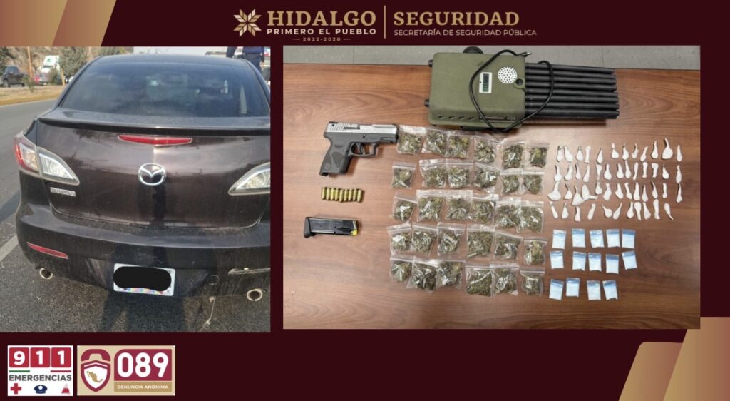Durante la intervención, también se les localizó un arma corta calibre 9 mm con un cargador abastecido, más de 516 dosis de distintas drogas (presunta marihuana y cristal), así como un inhibidor de señal de 16 antenas.