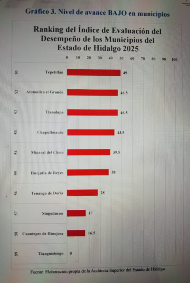 El municipio de Cuautepec de Hinojosa se ubicó entre las presidencias municipales peor evaluadas en el Índice de Evaluación del Desempeño de los Municipios de Hidalgo 2025, elaborado por la Auditoría Superior del Estado de Hidalgo (ASEH), al obtener una calificación de apenas 16.5 puntos sobre 100.