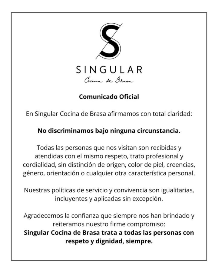 El restaurante Singular Cocina de Brasa difundió un comunicado oficial luego de que un creador de contenido que se hace llamar “Maestro Shifu” acusara públicamente al establecimiento de presuntos actos de discriminación durante una visita reciente. La denuncia, compartida en redes sociales, generó diversos comentarios y llevó al negocio a fijar postura.