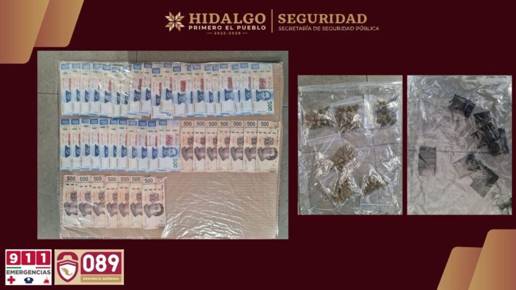 En el vehículo se localizaron diversas dosis de droga, 22 mil 500 pesos en efectivo y un equipo de telefonía celular que podría estar relacionado con la coordinación de estas actividades ilícitas.