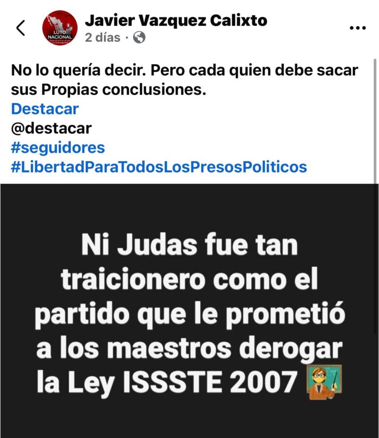 En la publicación escribió: “No lo quería decir. Pero cada quien debe sacar sus propias conclusiones”, acompañado de una imagen con la leyenda: “Ni Judas fue tan traicionero como el partido que le prometió a los maestros derogar la Ley ISSSTE 2007”.