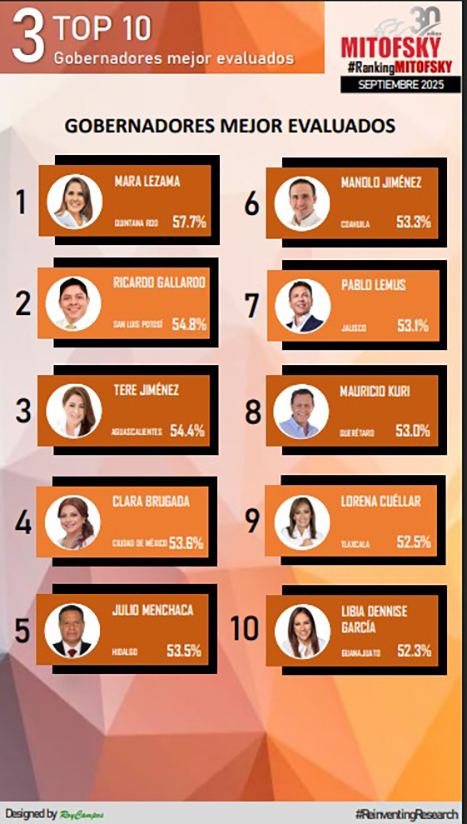 El gobernador de Hidalgo, Julio Menchaca Salazar, se mantiene entre los cinco mandatarios estatales mejor evaluados del país, según reveló el Ranking de la empresa Mitofsky,  correspondiente l mes de  septiembre de 2025.