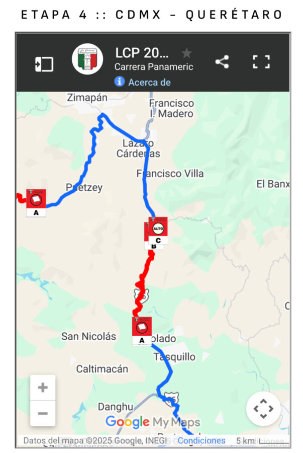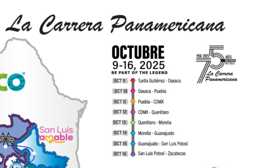 La Carrera Panamericana 2025 inició el 9 de octubre en Chiapas y concluirá el 16 de octubre en Zacatecas, recorriendo entidades como Oaxaca, Puebla, Querétaro, Michoacán, Guanajuato, San Luis Potosí y la Ciudad de México.