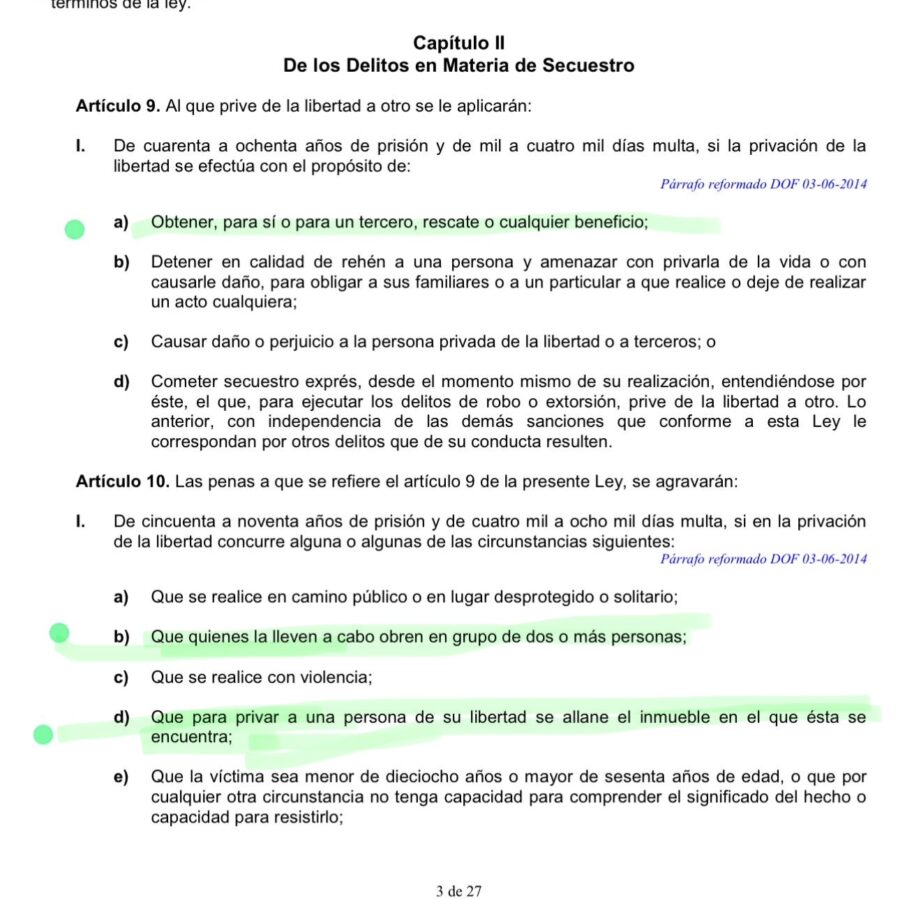 Asimismo, el Artículo 10 señala que las penas pueden agravarse —de 50 a 90 años de prisión— cuando concurran determinadas circunstancias, entre ellas que el acto sea cometido por dos o más personas o que se allane un inmueble para privar a alguien de su libertad.