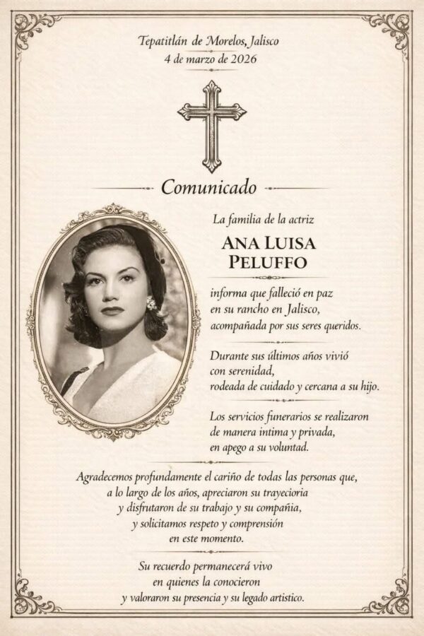 La actriz Ana Luisa de Jesús Quintana Paz Peluffo, conocida como Ana Luisa Peluffo, una de las figuras emblemáticas del cine mexicano de la llamada Época de Oro, falleció en su rancho ubicado en Tepatitlán de Morelos, en el estado de Jalisco, informó su familia mediante un comunicado fechado el 4 de marzo de 2026.