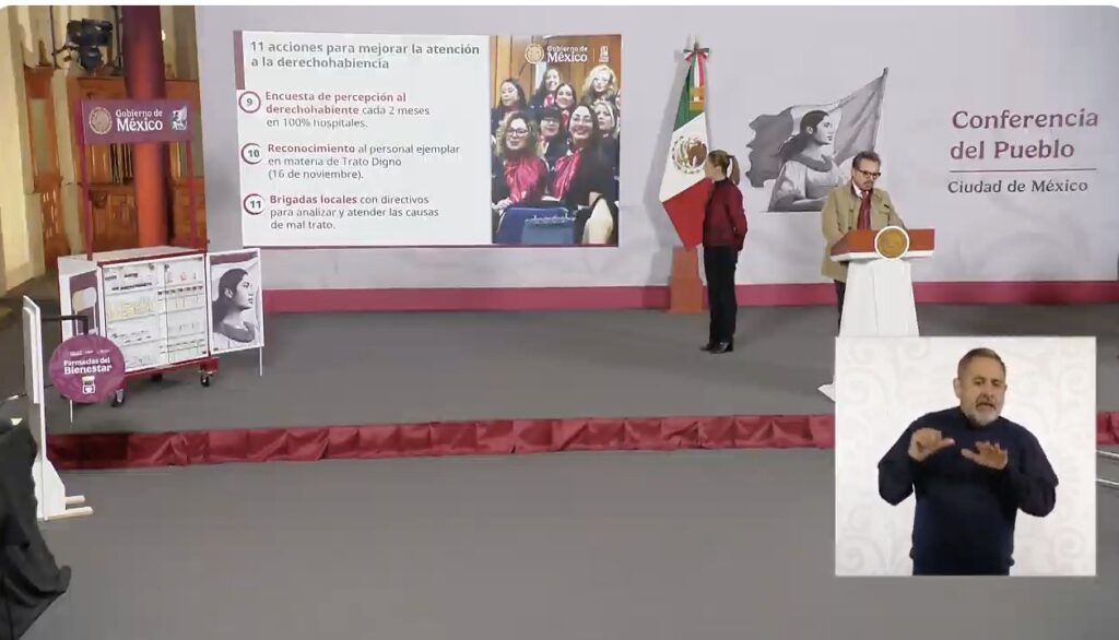 En la misma conferencia, el IMSS presentó avances de su estrategia Trato Digno, que contempla una nueva identidad del personal, la habilitación de 1,083 módulos con imagen institucional, un tablero virtual en tiempo real para seguimiento de casos complejos, la instalación de 546 nuevos módulos, contratación para turnos nocturnos y urgencias, certificación del 100% de Agentes de Trato Digno, encuestas bimestrales de percepción y brigadas de directivos para atender causas de maltrato.