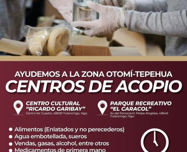 - Centros de acopio oficiales en Tulancingo: Centro Cultural “Ricardo Garibay” y el Parque “El Caracol”