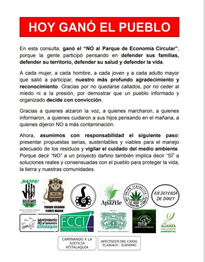 En el ámbito local, colectivos y organizaciones comunitarias de Hidalgo difundieron un posicionamiento conjunto bajo el mensaje “Hoy ganó el pueblo”, en el que reconocieron la participación ciudadana y el rechazo al parque como un acto de defensa del territorio, la salud y la vida.