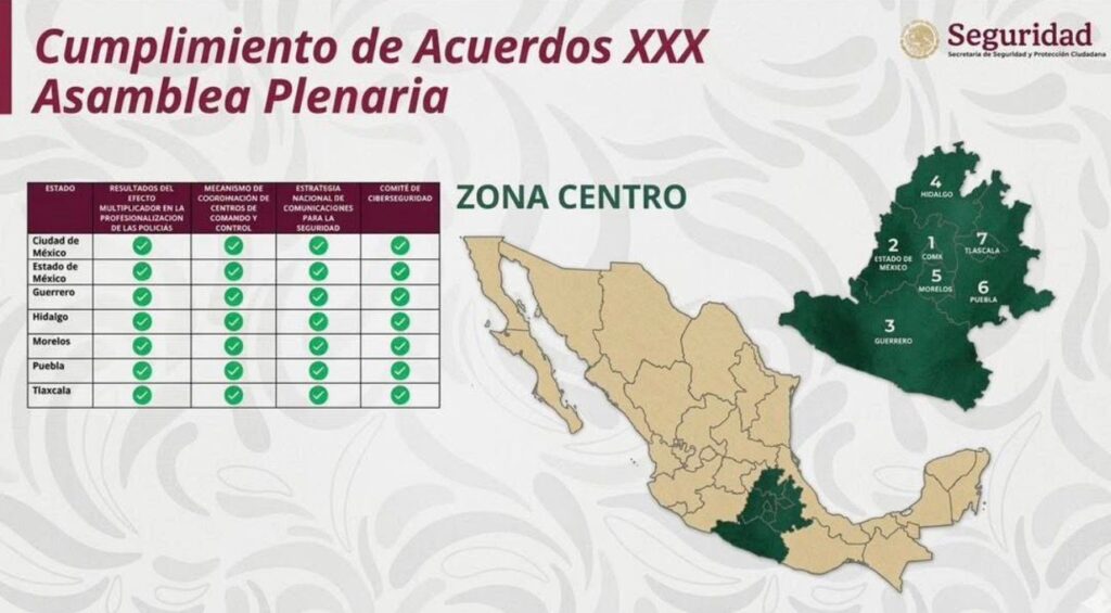 Durante la sesión, se reportó el cumplimiento de los acuerdos establecidos en la XXX Asamblea Plenaria, en coordinación con las entidades que integran la región centro: Ciudad de México, Estado de México, Guerrero, Morelos, Puebla, Tlaxcala e Hidalgo.