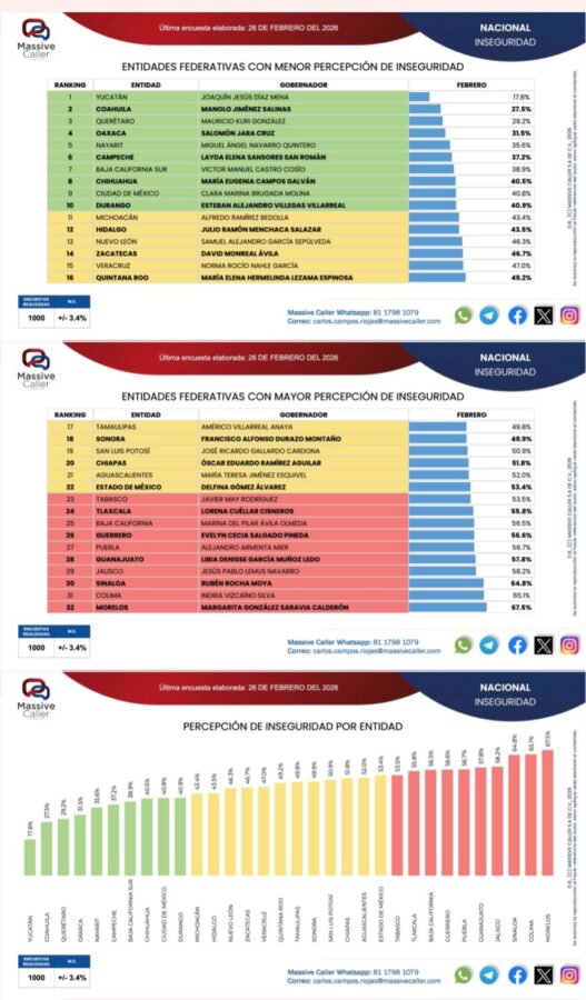 La casa encuestadora Massive Caller difundió su más reciente medición nacional de gobernadores, elaborada el 26 de febrero de 2026, donde Hidalgo se posiciona en el lugar 12 a nivel nacional entre las entidades con menor percepción de inseguridad, con un registro de 43.5 por ciento.