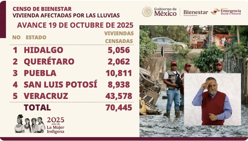 De acuerdo con el censo de viviendas afectadas, hasta el 19 de octubre se registraron 70,445 viviendas censadas en total: