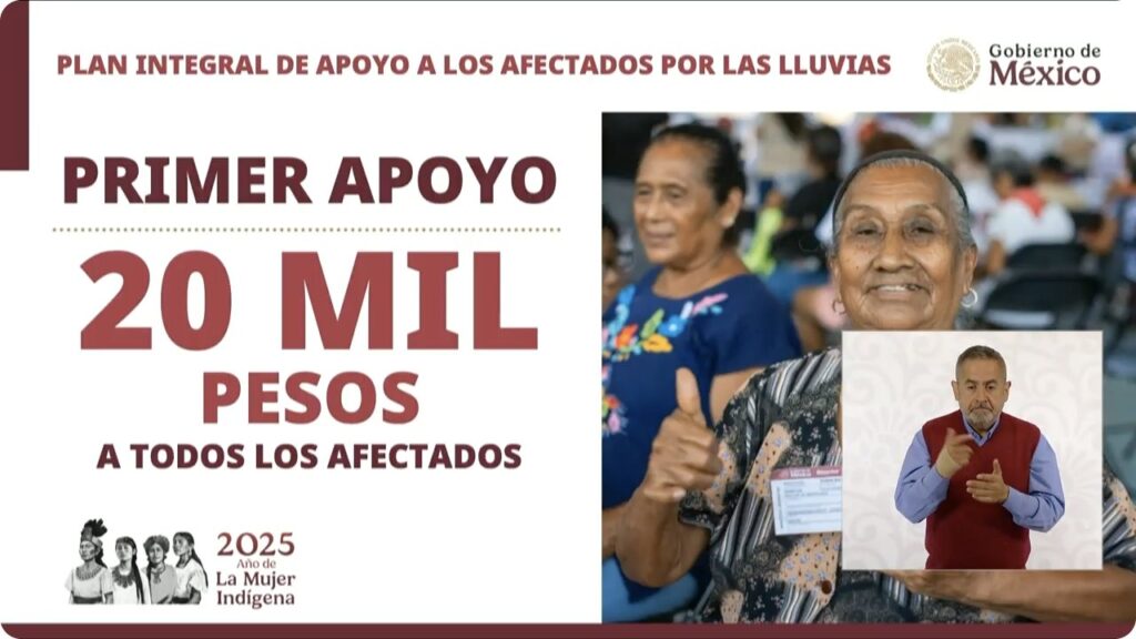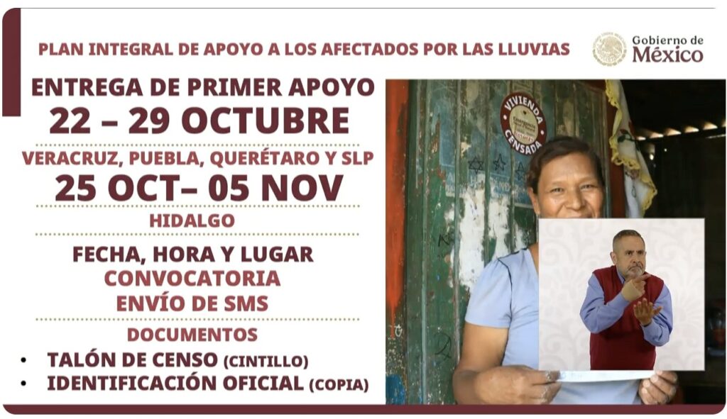 La presidenta Sheinbaum anunció que a partir del 22 de octubre comenzará la entrega del primer apoyo económico de 20 mil pesos por familia afectada en Veracruz, Puebla, Querétaro y San Luis Potosí, así como la entrega de vales de enseres domésticos —refrigerador, estufa, colchón, vajilla y ventilador— y vales de canasta alimentaria.