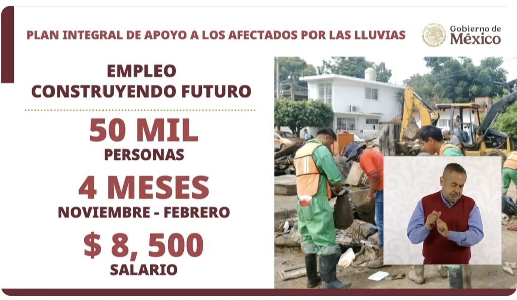 El gobierno federal también pondrá en marcha el programa “Empleo Construyendo Futuro”, mediante el cual 50 mil personas serán contratadas para labores de reconstrucción durante cuatro meses (de noviembre a febrero), con un salario mensual de ocho mil 500 pesos.