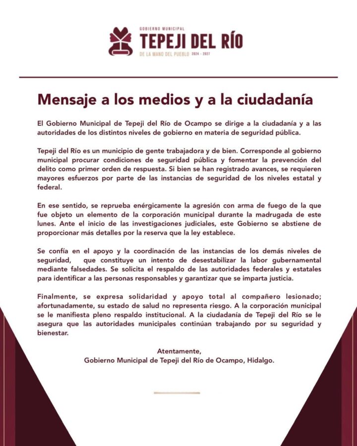 El Ayuntamiento de Tepeji del Río emitió un comunicado condenando enérgicamente la agresión con arma de fuego sufrida por el elemento policiaco, aunque advirtió que no puede proporcionar mayores detalles para no entorpecer las investigaciones. Hizo un llamado al Gobierno del estado y al Gobierno federal para intensificar el apoyo en materia de seguridad para capturar a los responsables.