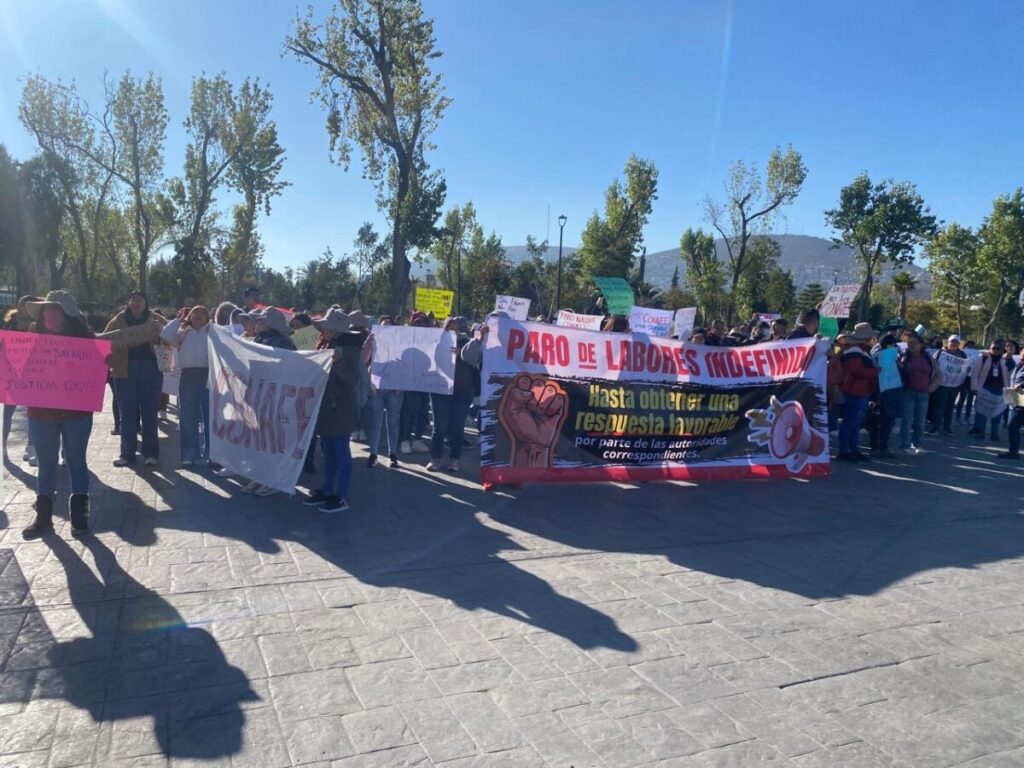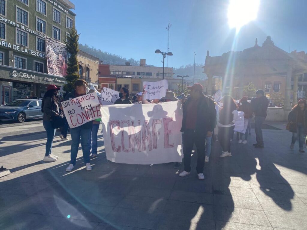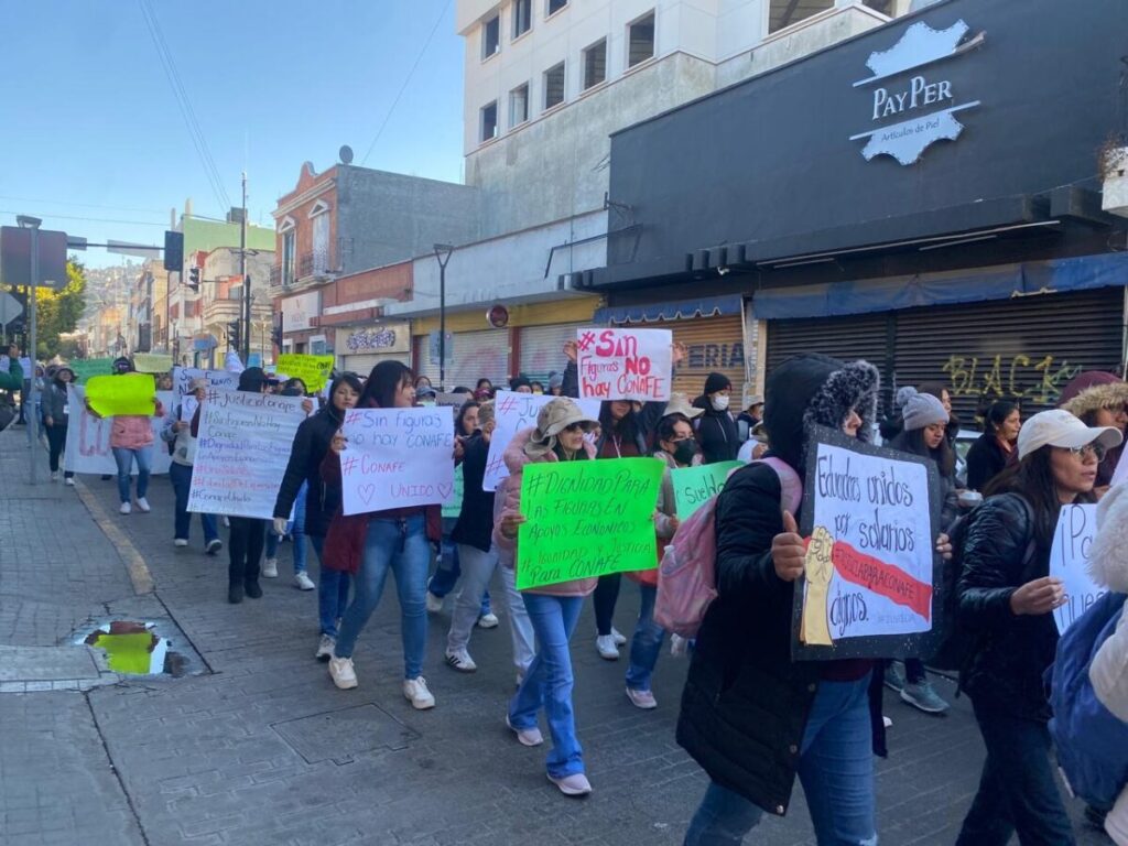 Alrededor de 100 maestros comunitarios que integran el sistema del Consejo Nacional de Fomento Educativo (CONAFE) se manifestaron este lunes en Pachuca, al marchar de Plaza Independencia a Plaza Juárez, para exigir mejores condiciones laborales y un incremento salarial.