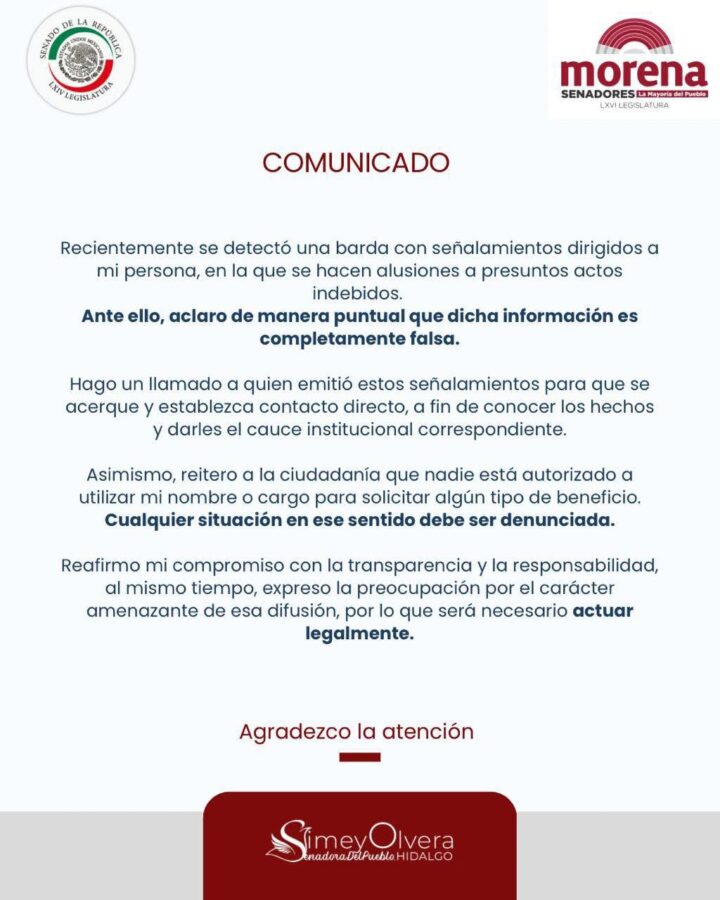 La senadora de Morena por Hidalgo, Simey Olvera Bautista, rechazó los señalamientos en su contra difundidos recientemente a través de una barda, en la que se hacen alusiones a presuntos actos indebidos, y aseguró que dicha información es “completamente falsa”.