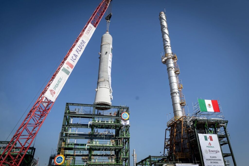 La presidenta de México, Claudia Sheinbaum Pardo, supervisó la colocación de un reactor hidrodesulfurizador de naftas como parte de la modernización de la Refinería de Tula, obra que forma parte de la inversión en ocho refinerías del país y que, de acuerdo con el Gobierno de México, ha permitido a Petróleos Mexicanos recuperar una producción superior al millón de barriles diarios.