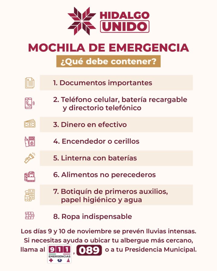 A través de la campaña “Hidalgo Unido”, el mandatario estatal recomendó preparar una mochila de emergencia con artículos esenciales en caso de requerir resguardo o evacuación. En esta deben incluirse documentos importantes, teléfono celular con batería recargable, dinero en efectivo, encendedor o cerillos, linterna con baterías, alimentos no perecederos, botiquín de primeros auxilios, papel higiénico, agua y ropa indispensable.