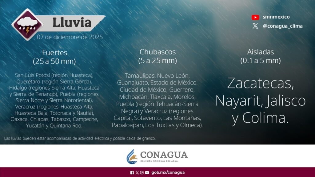 - Chubascos (5 a 25 mm): Guanajuato, Estado de México, Ciudad de México, Veracruz (diversas regiones), Michoacán, Tlaxcala, Morelos y Guerrero.