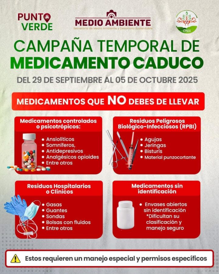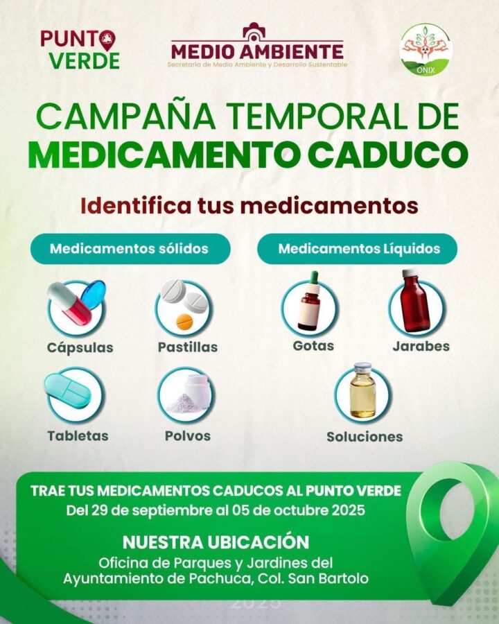 La Secretaría de Medio Ambiente y Desarrollo Sustentable de Pachuca llevará a cabo la Campaña Temporal de Medicamento Caduco, del 29 de septiembre al cinco de octubre de 2025.