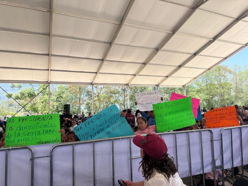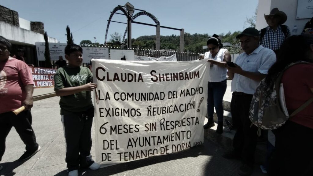 Durante la visita, en Tenango, de la presidenta Claudia Sheinbaum, habitantes de zonas afectadas el pasado octubre, se presentaron con lonas y cartulinas para demandar reconstrucción de caminos, carreteras y puentes; reubicación pronta de habitantes de zonas de riesgo; dragado de ríos y limpieza de áreas aledañas a zonas habitacionales; programas de vivienda, entre otras.