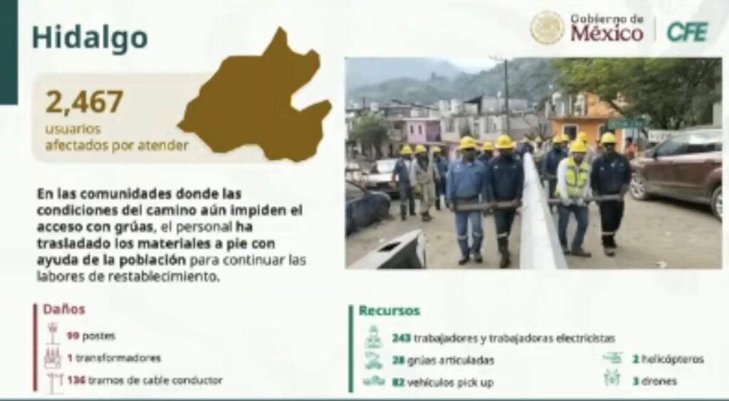 Para atender esta situación, 243 trabajadores y trabajadoras electricistas, apoyados por 28 grúas articuladas, 82 vehículos pick up, 2 helicópteros y 3 drones, trasladan materiales incluso a pie con ayuda de habitantes locales para acelerar el restablecimiento.