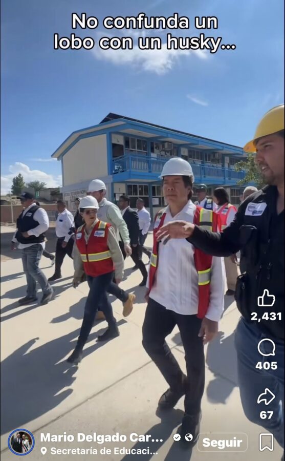 En los materiales difundidos, Delgado Carrillo aparece en recorridos de supervisión de obras, acompañado del mensaje: “Otros gobiernos: ‘nosotros también construimos escuelas’”, seguido de imágenes de infraestructura educativa en proceso o ya concluida.