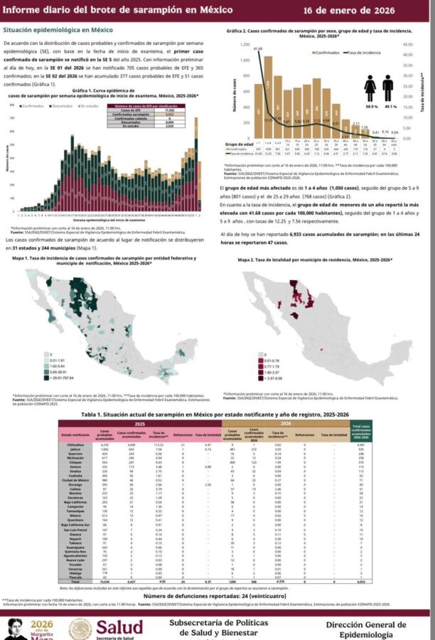 El Informe diario del brote de sarampión en México, con corte al 16 de enero de 2026, señala que a nivel nacional se acumulan 6 mil 933 casos confirmados, de los cuales 47 se reportaron en las últimas 24 horas.