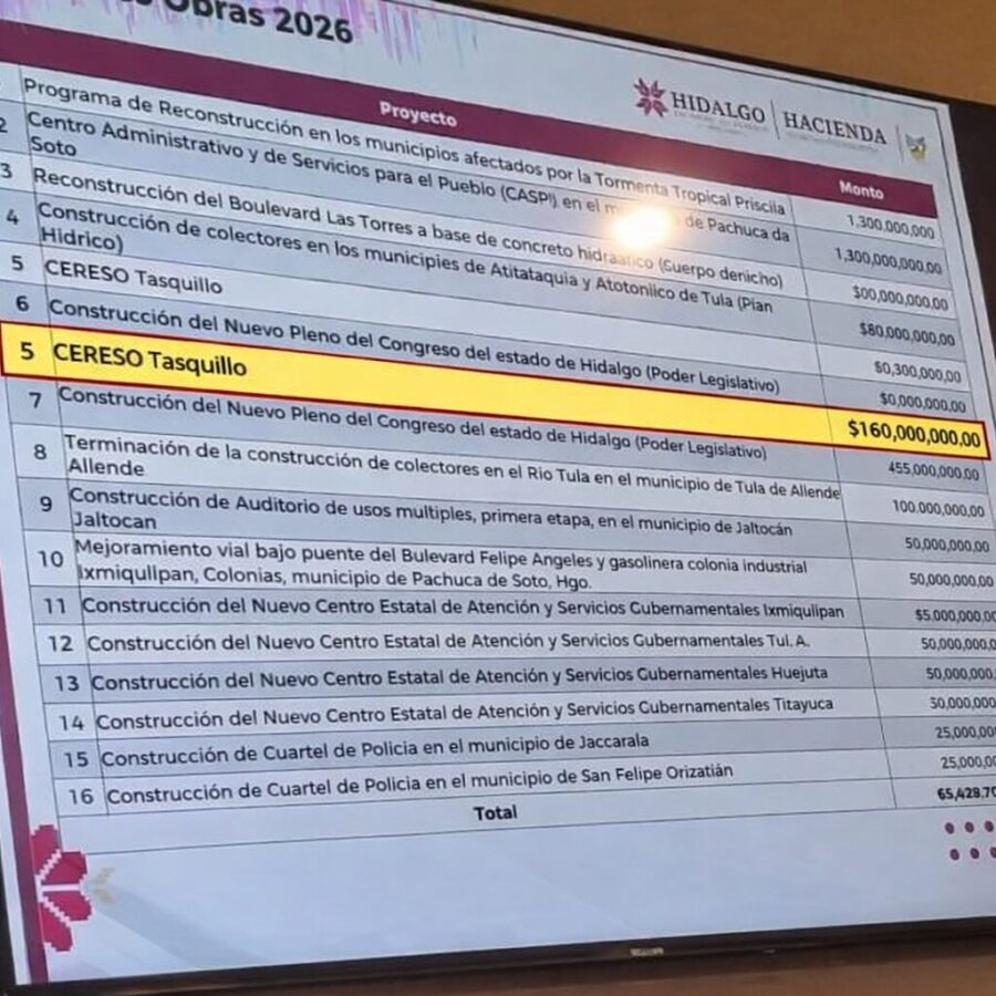 Dentro de este listado, el punto número cinco destaca por su impacto social y político: la construcción del CERESO Tasquillo, obra para la cual se asigna un monto de 300 millones de pesos, según el documento exhibido.
